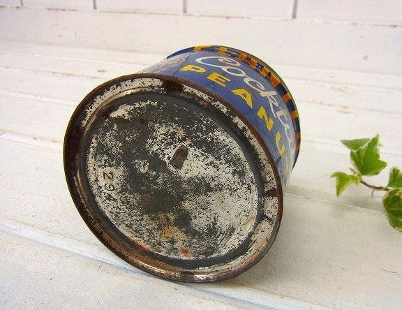 ピーナッツが入っていた小さなブリキ缶で、ブルーボディにキャラクター【MR .PEANUT(ミスターピーナッツ)】やたくさんの文字がプリントされた、可愛いパッケージです。