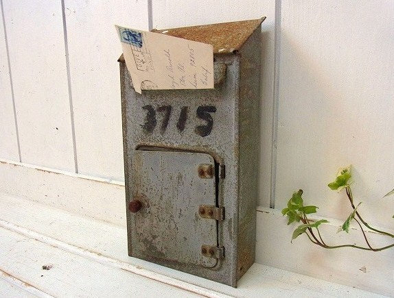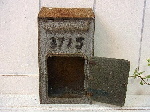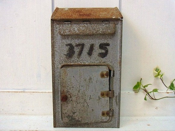 アメリカで見つけました・・グレー色のティン製・アンティーク・メールボックスです。