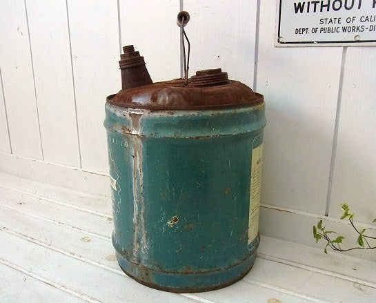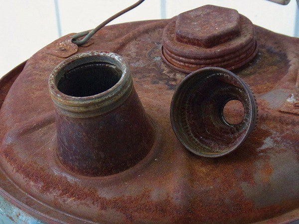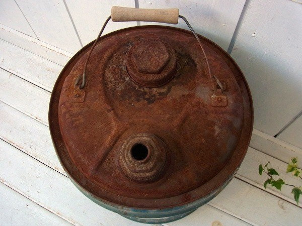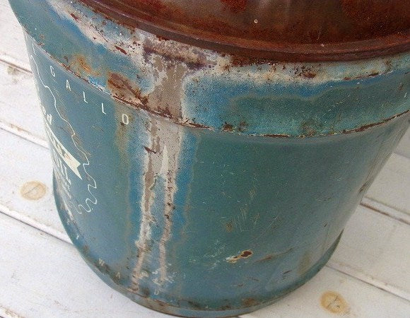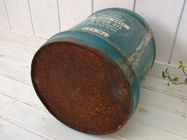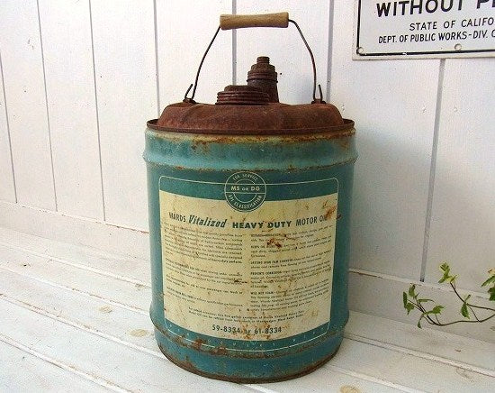 業務用のモーターオイルが入っていた、ハンドル付きの古いオイル缶になります。