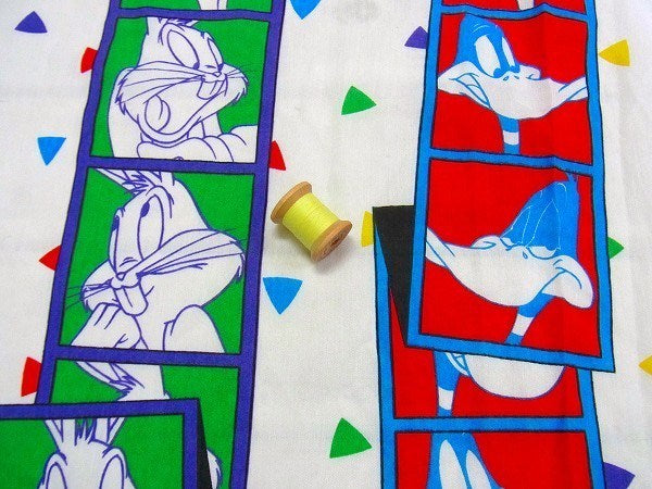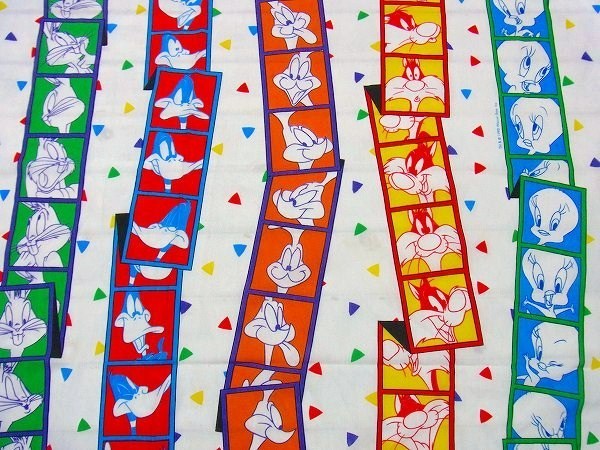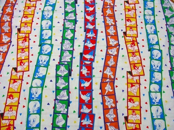 アメリカで見つけました・・ワーナーブラザーズを代表するアニメ『ルーニー・テューンズ』のフィルム柄・USEDフラットシーツです。(ツインサイズ)
