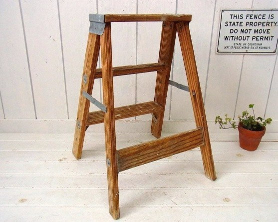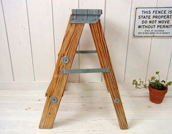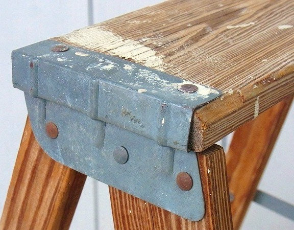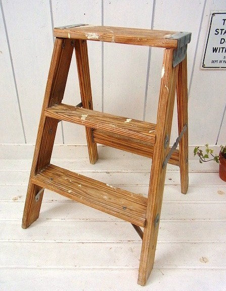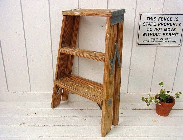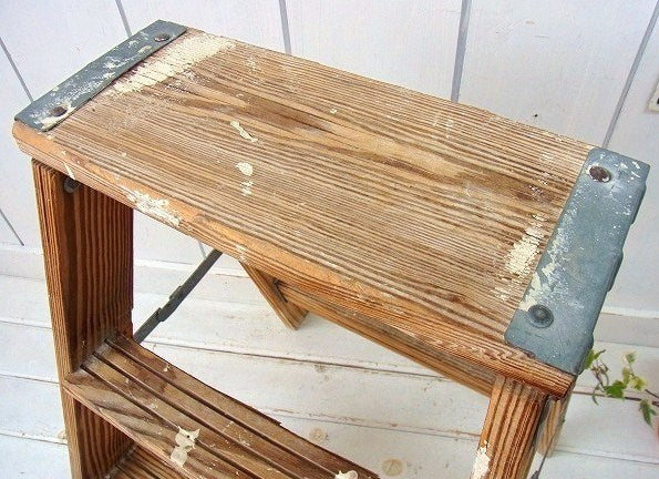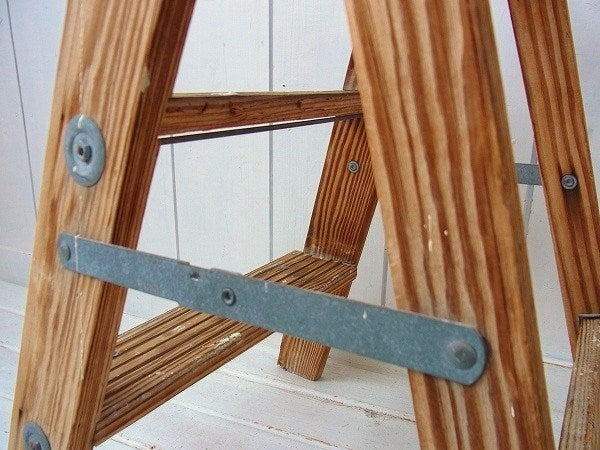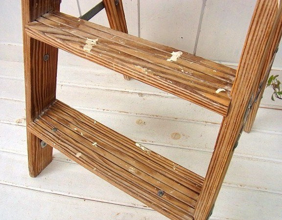白いペンキの付いた木製・ヴィンテージ・ステップラダー/脚立 USA