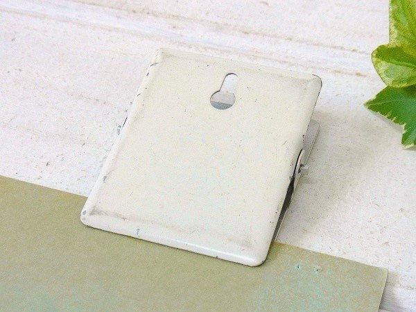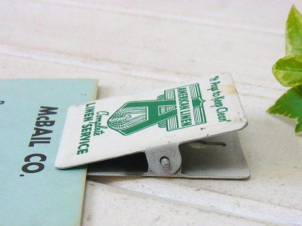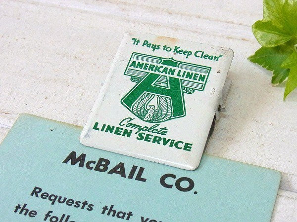 アメリカで見つけました・・『AMERICAN LINEN supply』のスチール製・ノベルティ(販促品)・ヴィンテージ・クリップです。 ホワイトベースに、【“It Pays to Keep Clean”AMERICAN LINEN Complate LINEN SERVICE】とグリーンのプリントが入っております。 ボトムに穴がございますので、壁に掛けてもお使いいただけます。 メモやレシートをまとめたり・・お部屋やデスク上・作業台のアクセントなどに・・♪ 経年による多少のヨゴレ・スレ・キズ・金具サビ等ございますが、造りはしっかりとしております。 ヴィンテージ・書類は付いておりません。 画像(写真)でのご判断を宜しくお願い致します。 ■size :約 W5cm×D5.7㎝×H1.8cm          ■コンディション : ★★★★☆ ■メール便¥160対応可(補償なし) ※ご注文の際、お手数ですがメッセージ欄にメール便・希望とご記入下さい。新たにお見積もりをメールにてお知らせさせていただきます。