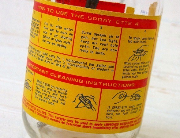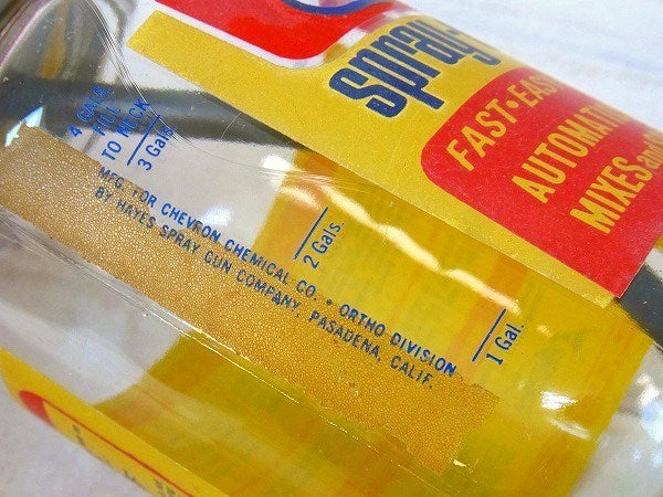 上部ふたサイドに【FAYES EPRAY GUN CO. PASADENA, CALIF.】のエンボス文字、ボトル側面に【ORTHO Spray-ette FAST・EASY・ACCURATE AUTOMATICALLY MIXES and SPRAYS】とカラフルな英文字プリント、両サイドに目盛り等が入っております。