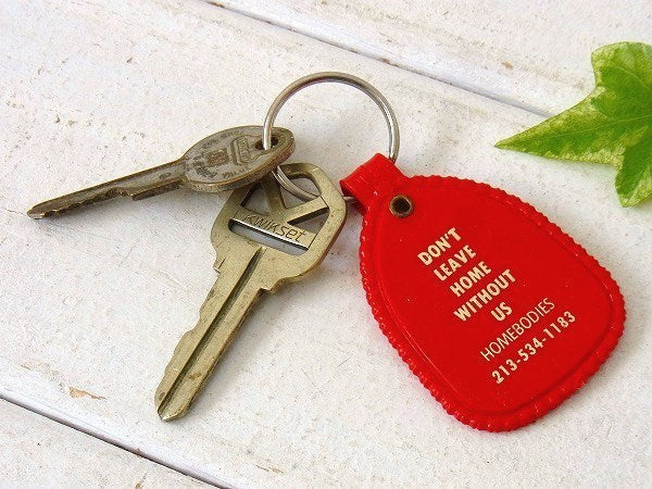 赤色のキーホルダーに【DON'T LEAVE HOME WITHOUT US HOMEBODIES 213-534-1183】と文字が入っております。