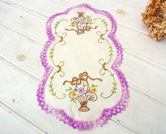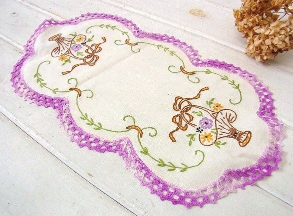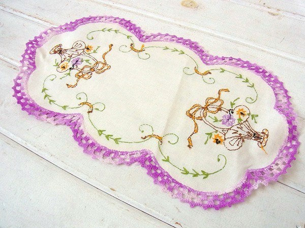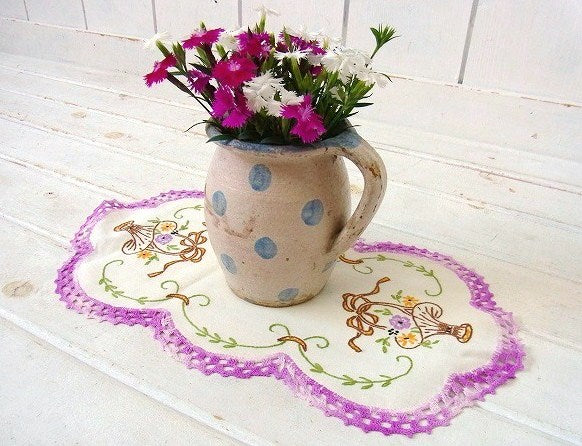 アメリカで見つけました・・手刺繍入りのデッドストック未使用・アンティーク・ドイリーです。 縁取りは手編みされたパープル色・グラデーションカラーのクロッシェレースです。 真ん中は少し生成りがかった丸い麻布製で、フラワーバスケットとリーフ柄の手刺繍が施されております。 花瓶やフラワーポットに敷いたり・・テーブルやチェスト上のアクセント・インテリアなどに・・♪ デッドストック未使用品です。 アンティーク・水差しは付いておりません。 画像(写真)でのご判断を宜しくお願い致します。 ■SIZE :約 W38.3cm×H21.4cm  ■コンディション : ★★★★★ ■レターパックライト¥360対応可(追跡サービスあり・補償なし) ※ご注文の際、お手数ですがメッセージ欄に『レターパックライト希望』とご記入下さい。新たにお見積もりをメールにてお知らせさせていただきます。