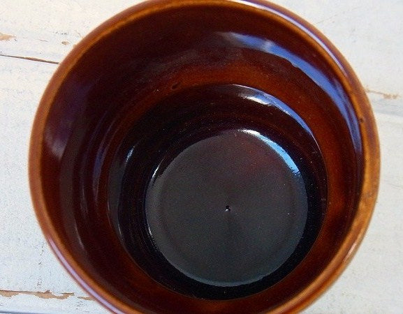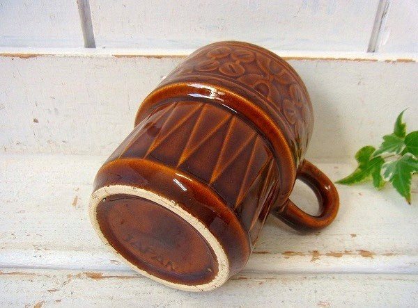 ツヤのあるブラウン色ボディで、上部はコーヒー豆のような模様、下部は幾何学模様のレトロなデザインになっております。