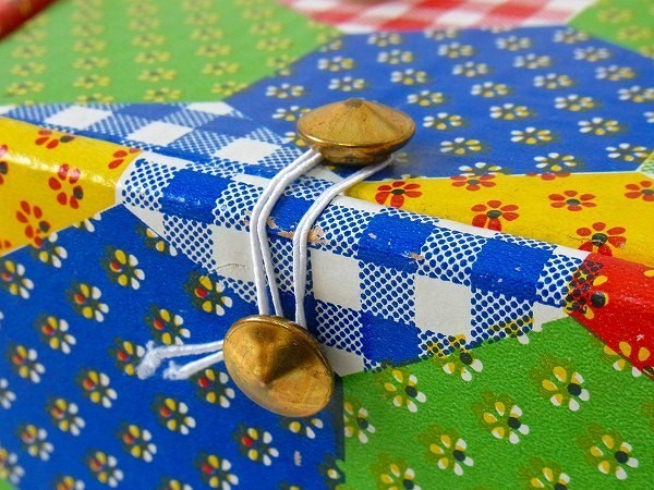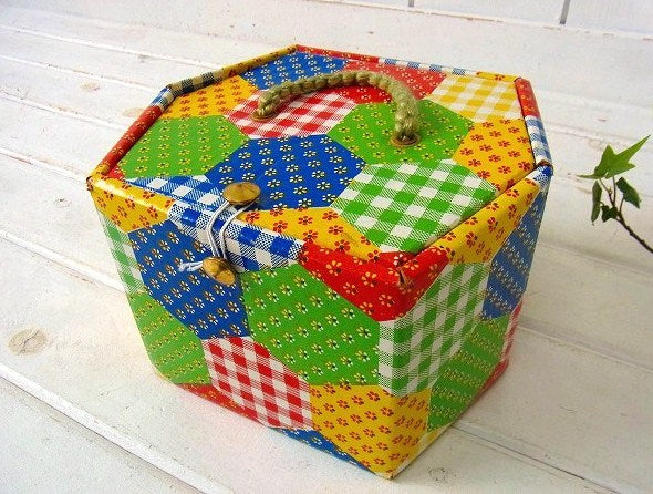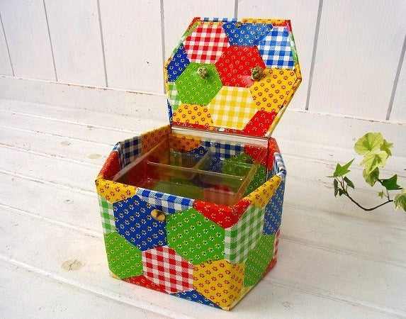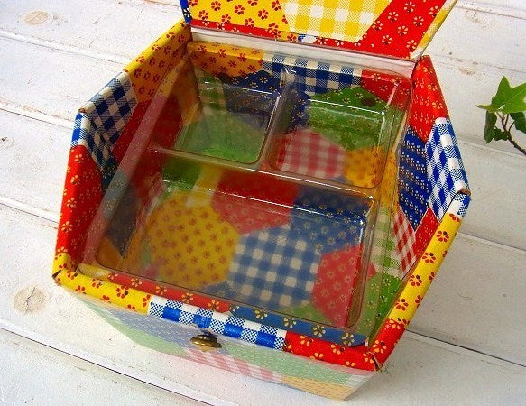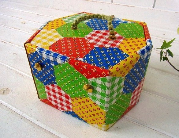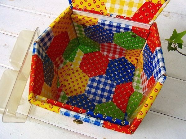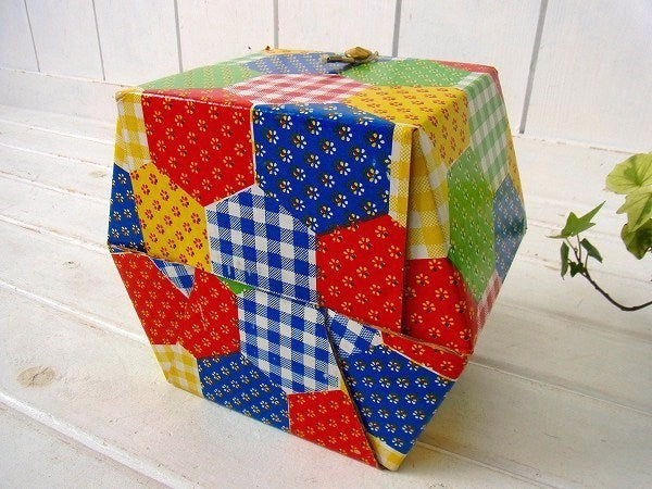 アメリカ製!カラフルなパッチワーク柄・厚紙製・2段式・ヴィンテージ・ソーイングボックス/裁縫箱