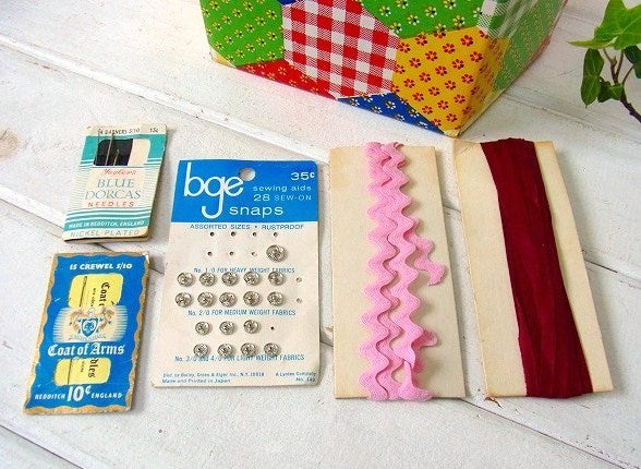 山道テープや針・スナップボタンなど、5種類のヴィンテージ・ソーイング小物が付属いたします(画像参照)。
