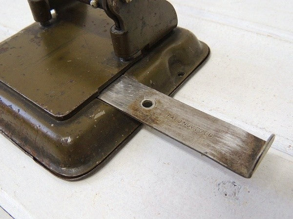アメリカで見つけました・・カーキ色のメタル製・2つ穴・アンティーク・ペーパーパンチです。
