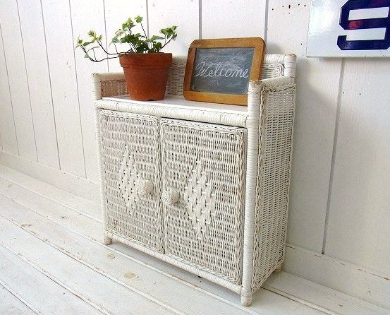 アメリカで見つけました・・白色の扉付きアンティーク・ウィッカーシェルフです。