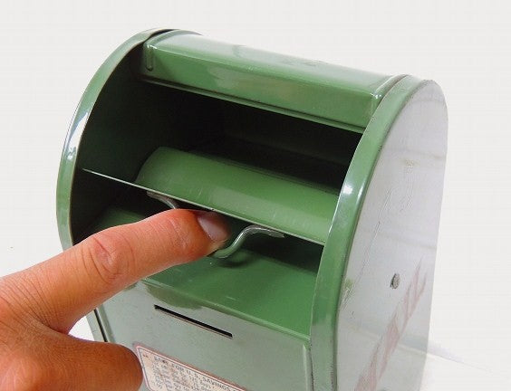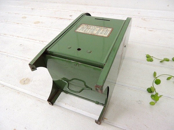 アメリカで見つけました・・アメリカの郵便ポストの形をした、オリーブグリーン色のメタル製・ヴィンテージ・コインバンク(貯金箱)です。