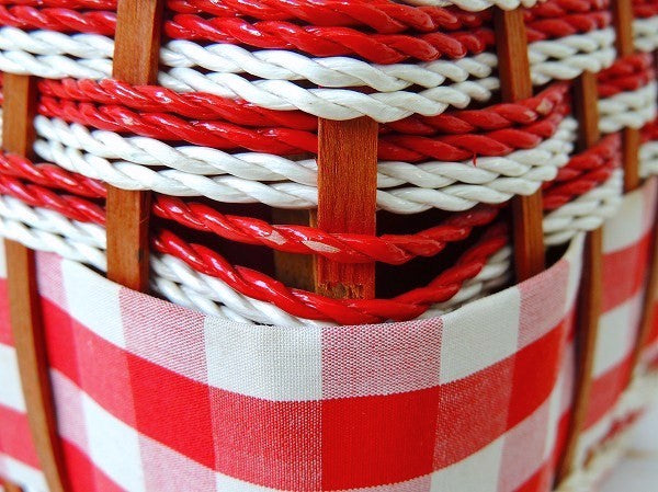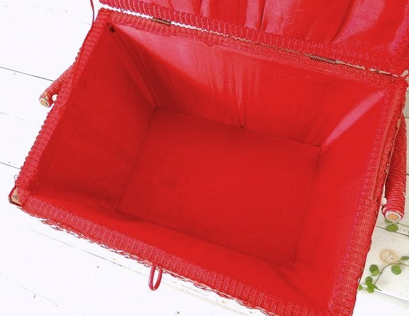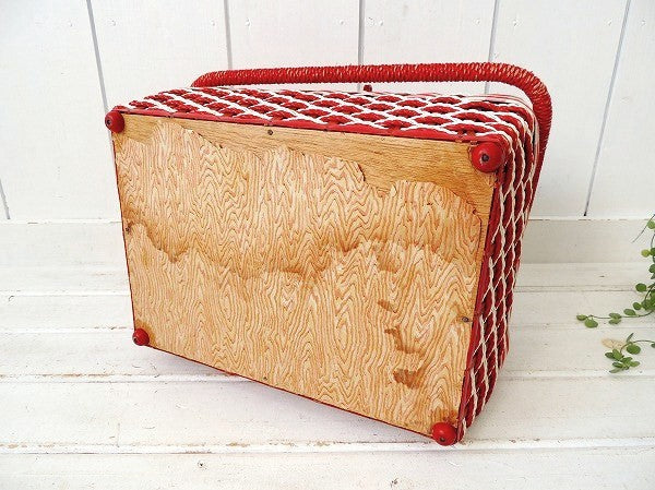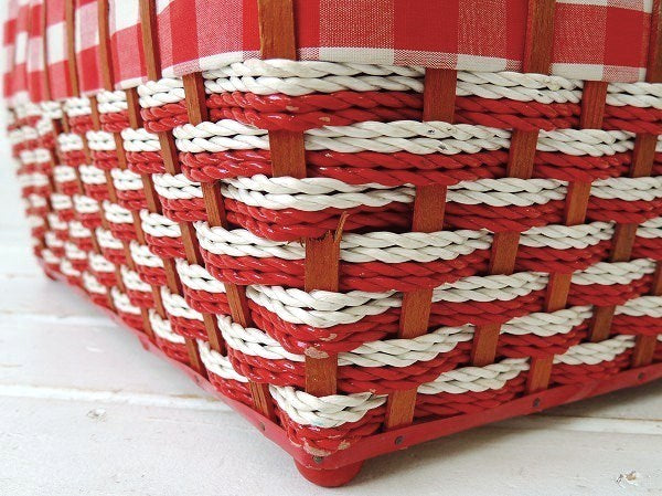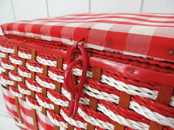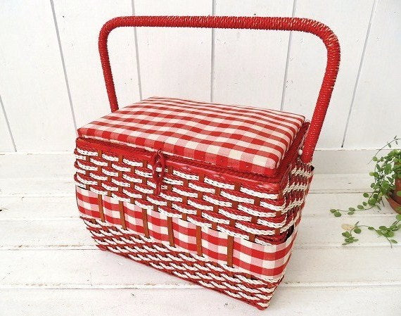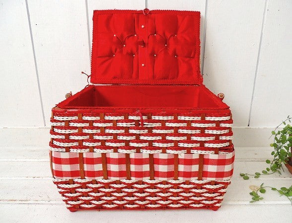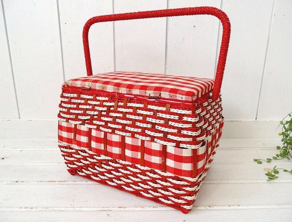 ギンガムチェック柄/レッド×ホワイト色のレトロなヴィンテージ・ソーイングボックス/裁縫箱/手芸用品