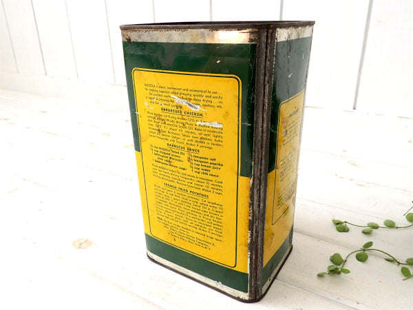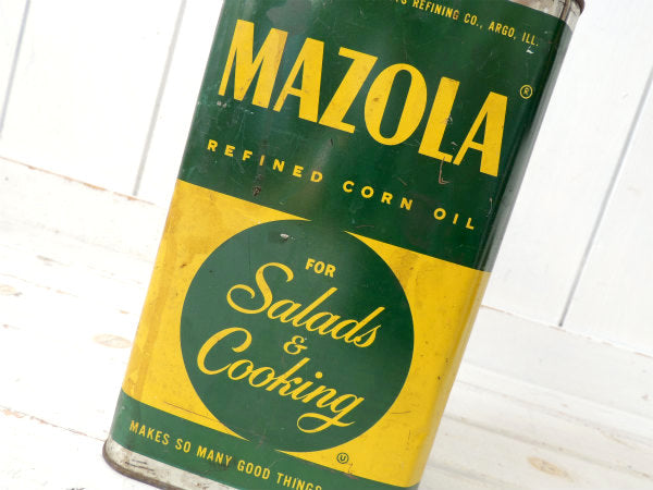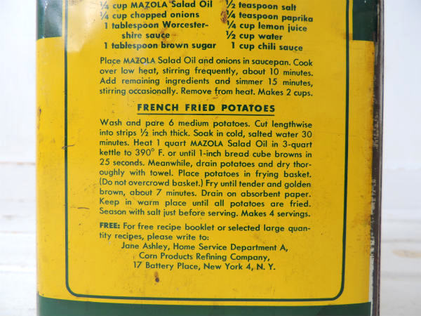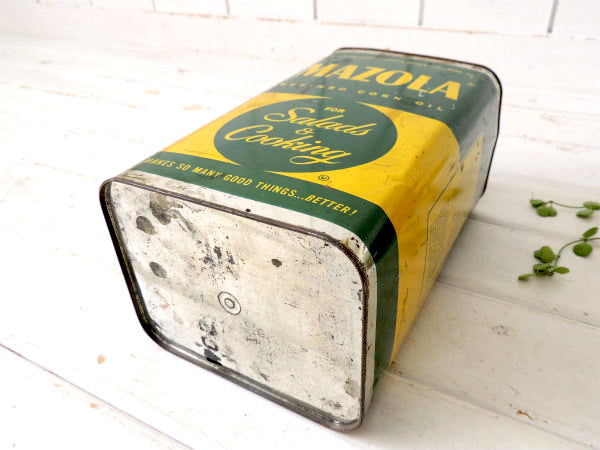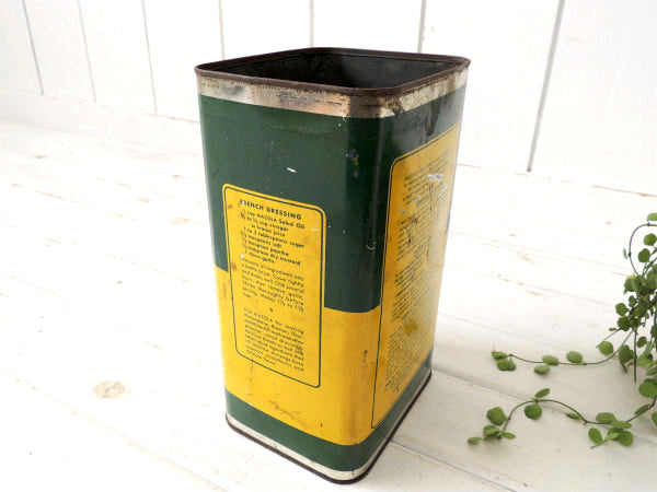 コーンオイルが入っていたブリキ缶で、インパクト大のグリーン×イエローカラー【MAZOLA/REFINED CORN OIL/FOR Salads& Cooking....New York...】フレンチドレッシングの作り方等 英数字がたくさんプリントされた、可愛いパッケージです。