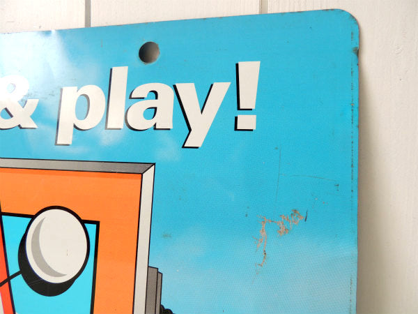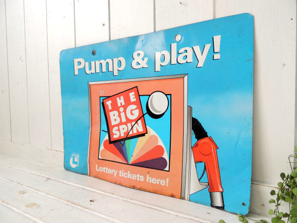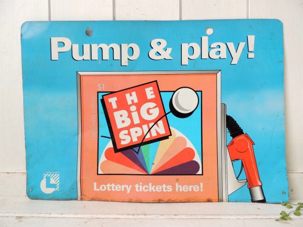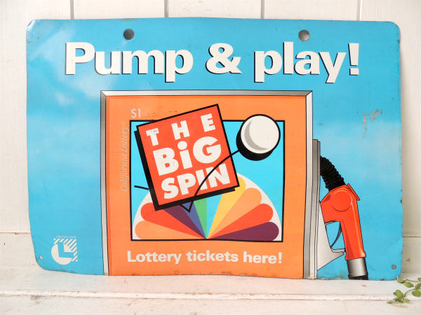 アメリカ西海岸でみつけました・・カリフォルニア州の宝くじ『California Lottery/Pump&play!』のヴィンテージ・スチール製 両面サイン (宝くじ看板)です。