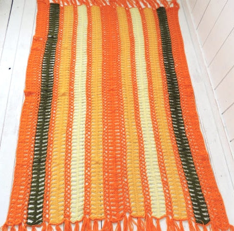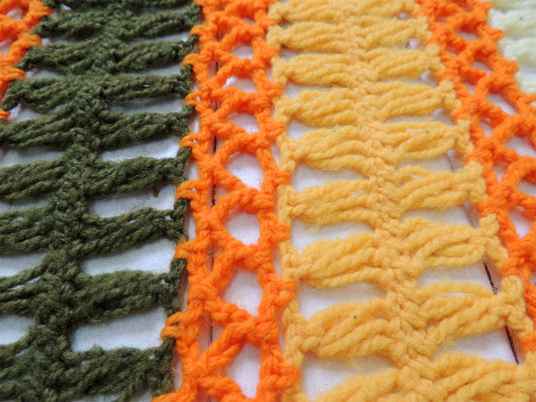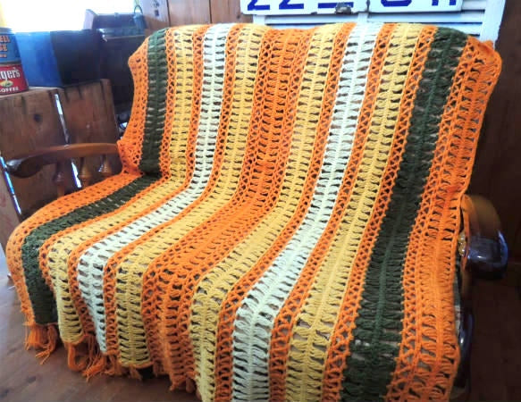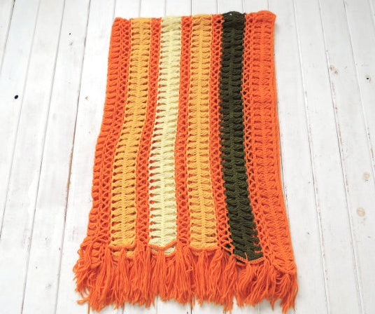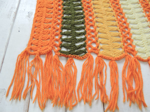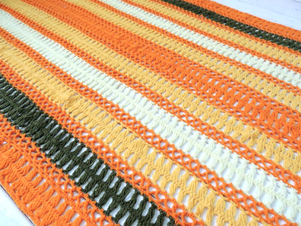 USA!レトロな配色の手編みニット・フリンジ付き・大きなヴィンテージ・ブランケット/ひざ掛け