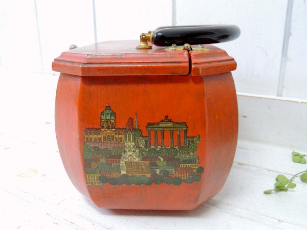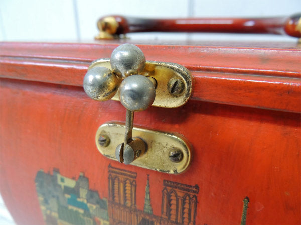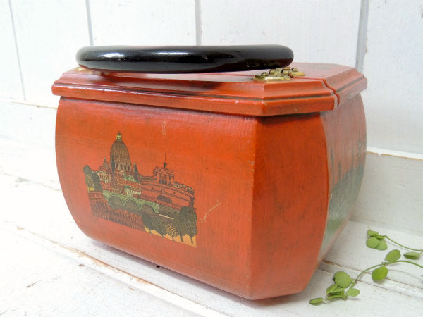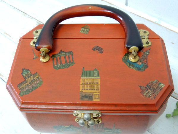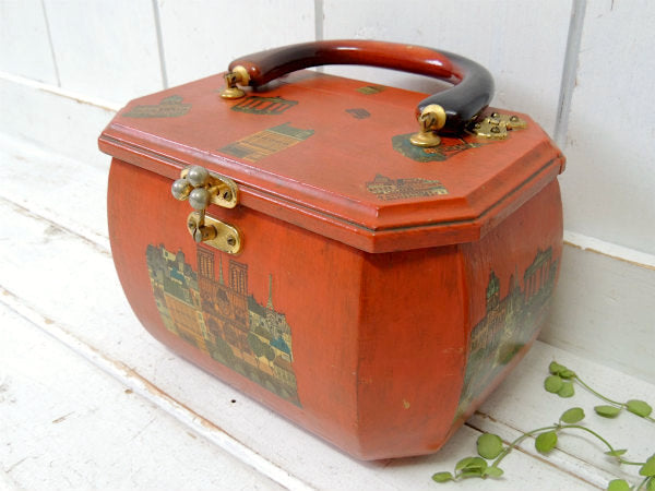 エッフェル塔&ロンドンバス&ノートルダム大聖堂柄・木製・ヴィンテージ・ハンドバッグ/カバン