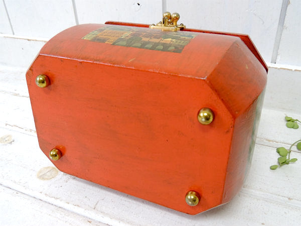 赤茶色の木製ハンドバッグに、フランス/パリ(エッフェル塔・ノートルダム大聖堂)やイタリア(コロッセオ・サンピエトロ大聖堂・サンタンジェロ城)・イギリス(ウェストミンスター宮殿・タワーブリッジ・ロンドンバス)の街並&観光名所のデカール装飾が施されております。