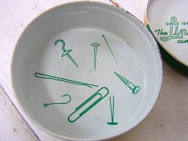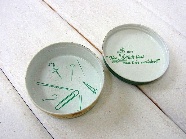 カーボン紙のインクリボンが入っていた、グリーン×ベージュ色の蓋付きの缶です。