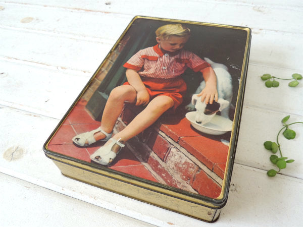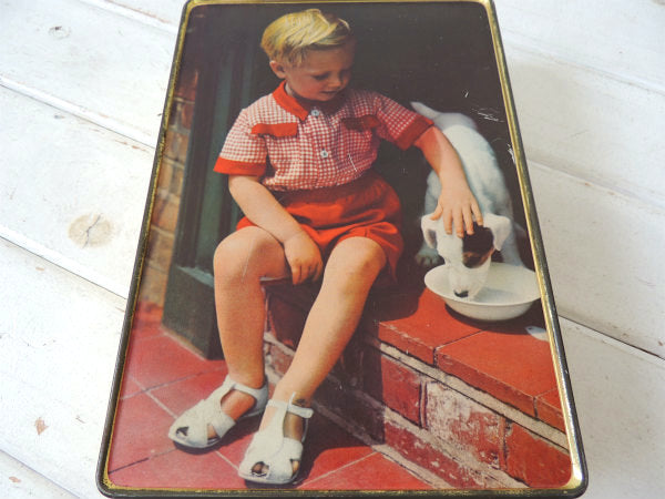 ゴールド色の缶で、フタには子犬にミルクをあげている小さな女の子の、とっても可愛いピクチャープリントです。