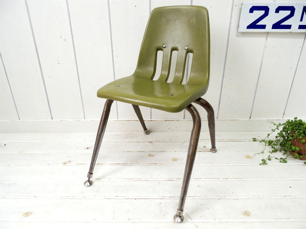 アメリカ西海岸で見つけました・・アメリカ『VIRCO社製(ヴァルコ)』のオリーブグリーン色・ヴィンテージ・スクールチェア(キッズチェア)です。