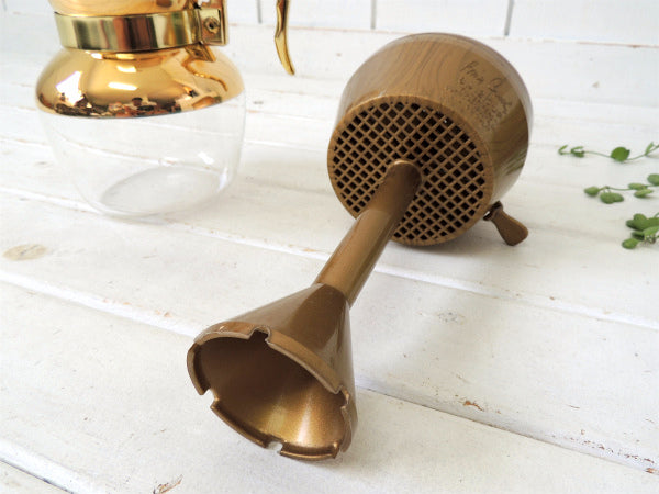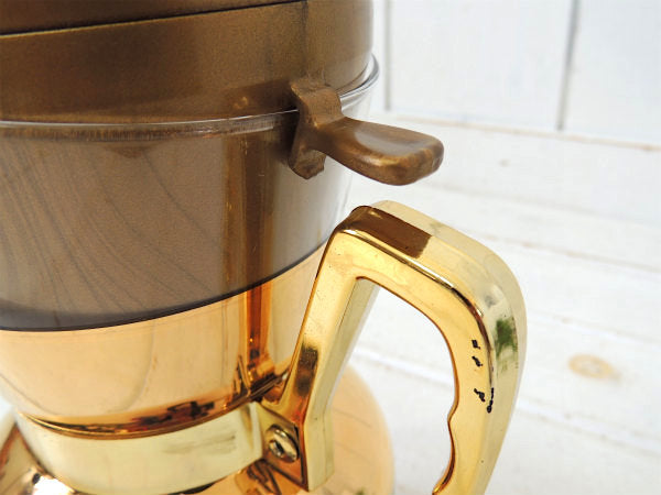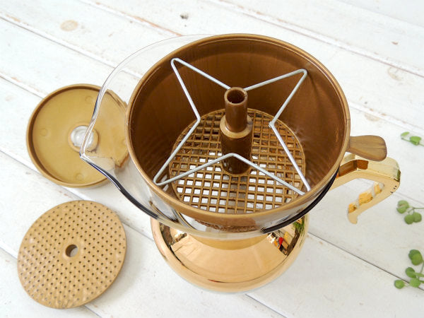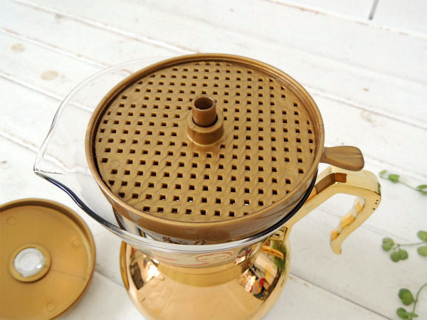 コーヒーポットはコーニング社製のガラス製で、内側のパンプやバスケット・受け皿はゴールド色のプラスティック製、バンド部分は金属製、ハンドルはプラスティック製になります。