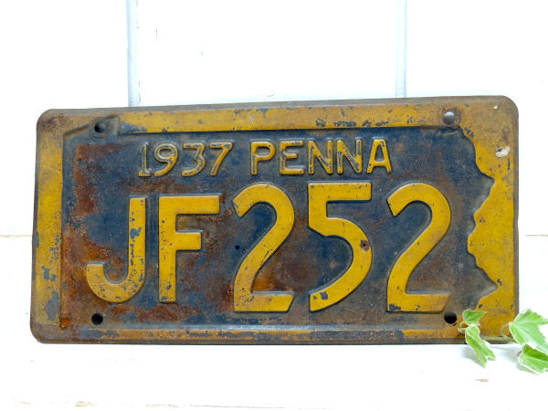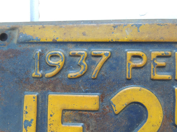 アメリカ・ペンシルベニア州の1937年 ネイビー×イエロー エンボス英数字のヴィンテージ・ナンバープレートです。