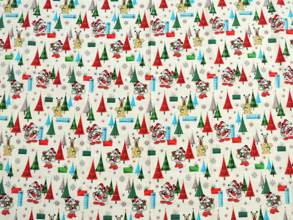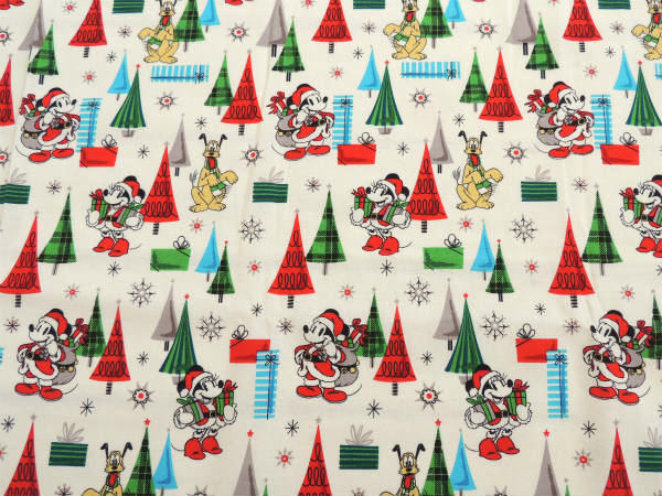 アイボリー色ベースに、サンタクロース姿のミッキー&ミニー・マフラーを巻いたプルート・クリスマスツリー・プレゼントなどの、とっても可愛い総柄プリントです。