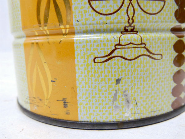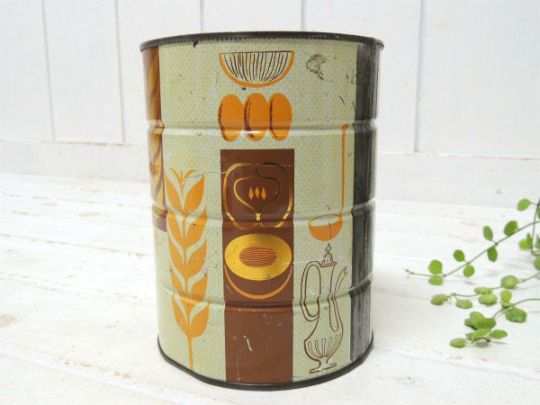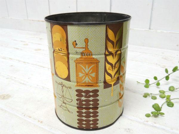 コーヒーが入っていた筒型のブリキ缶で、コーヒーグラインダーやスケール・ポット・豆・リーフ柄など、レトロな絵柄が入っております。