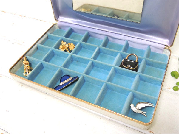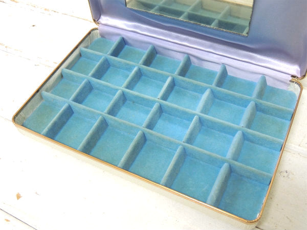白色のボディー部分はビニールレザー製で、内張は水色のベルベット製、フタ内側は薄いパープル色のサテン素材です。