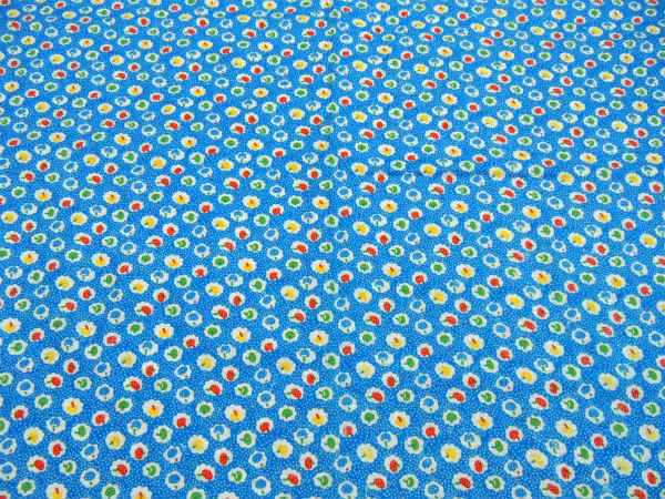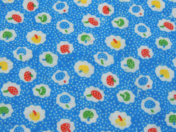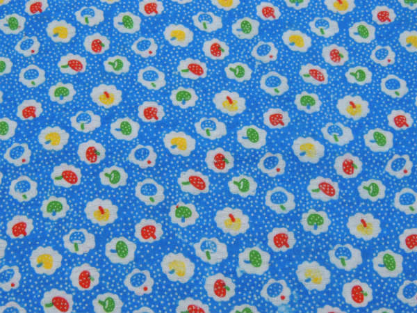 青色×白色の水玉ベースに、小さくてカラフルなキノコの総柄プリントです。