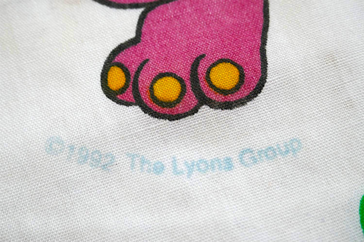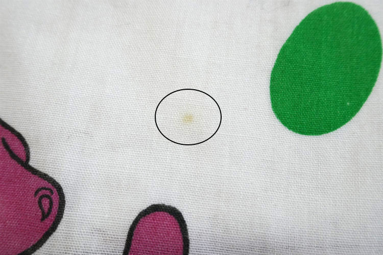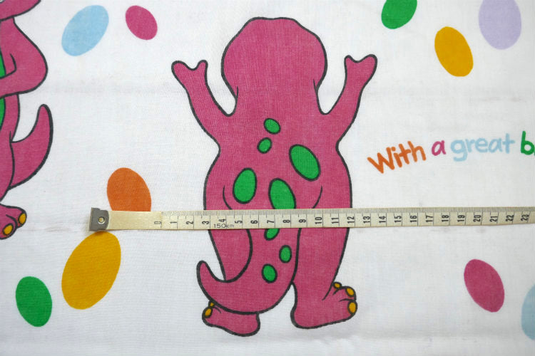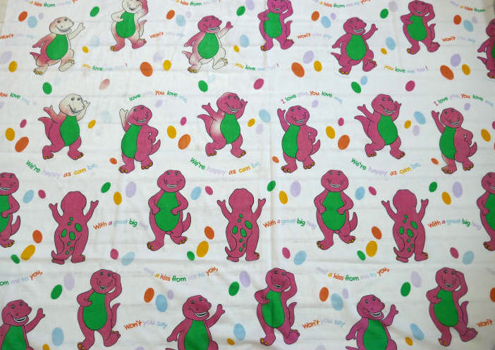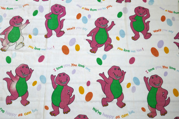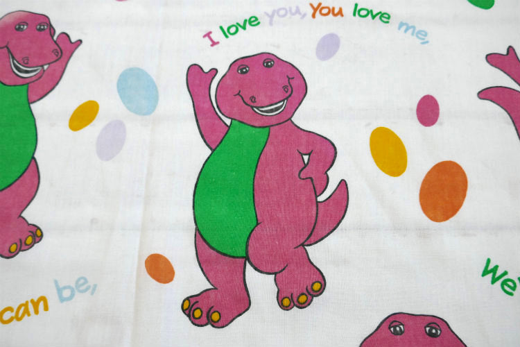 アメリカ西海岸・カリフォルニア州・ロサンゼルスで見つけました・・アメリカの子供向けテレビ番組の恐竜型キャラクター『バーニー&フレンズ(Barney & Friends)』のUSEDフラットシーツです。(ツインサイズ)