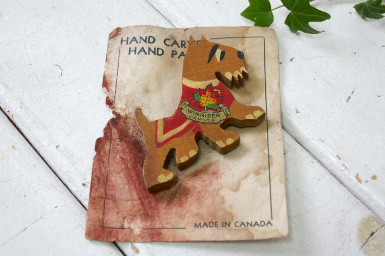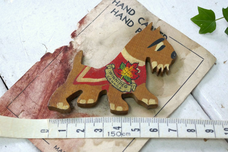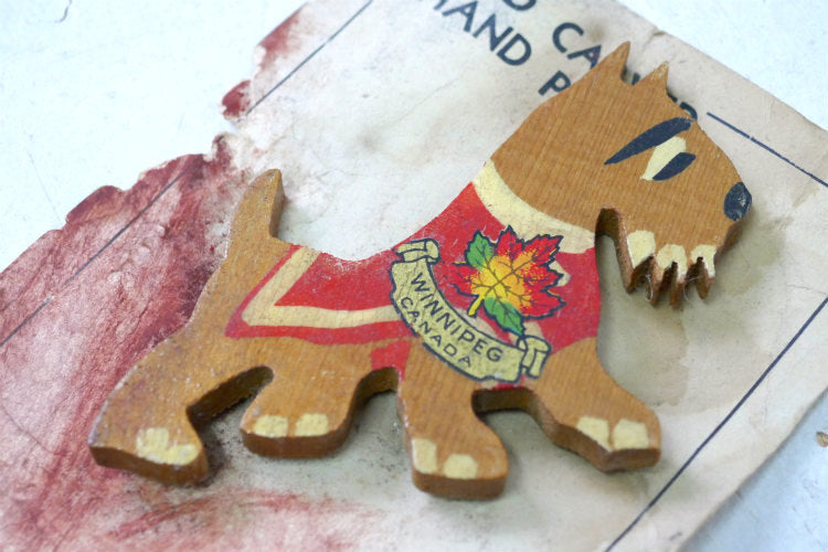 スコティッシュテリア(犬)の形をした木彫りのブローチで、カナダの国旗にも使用されている、メープルリーフのシンボルロゴ&【WINNIPEG CANADA】の手書き文字が入っています。