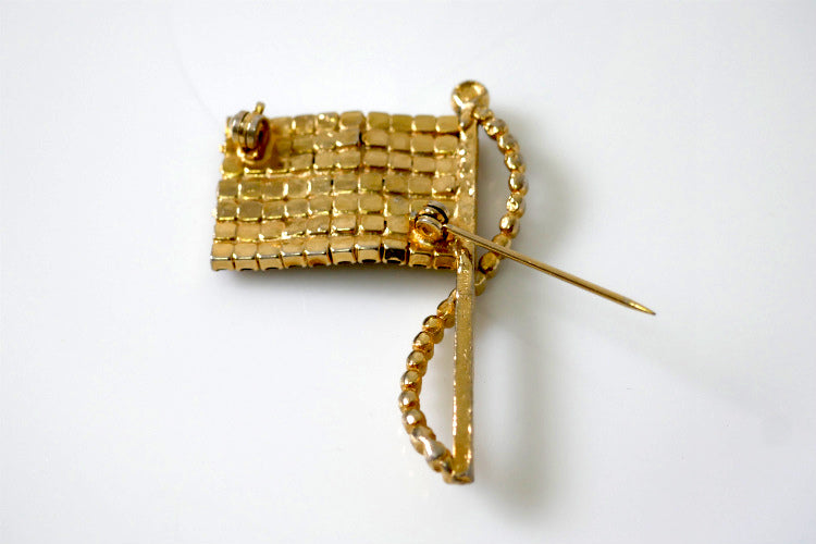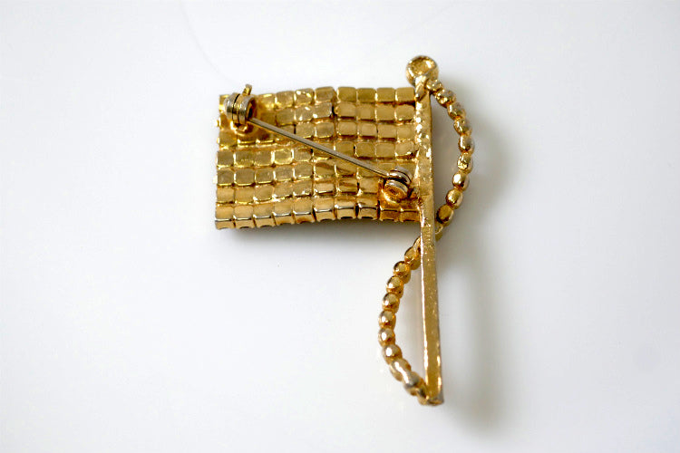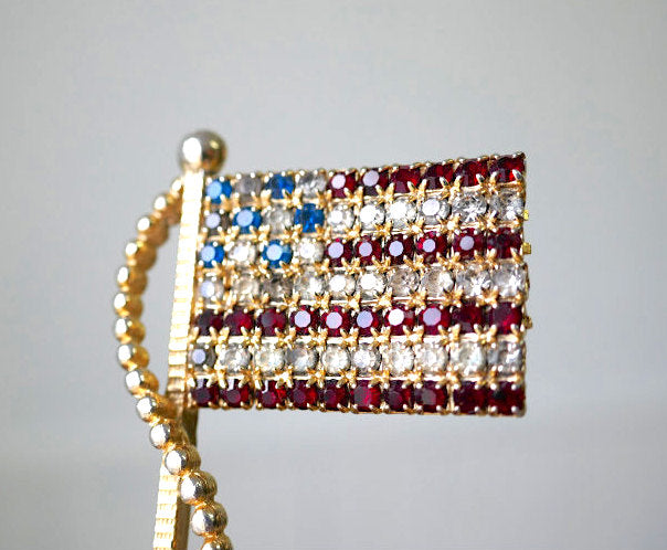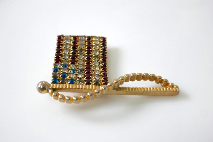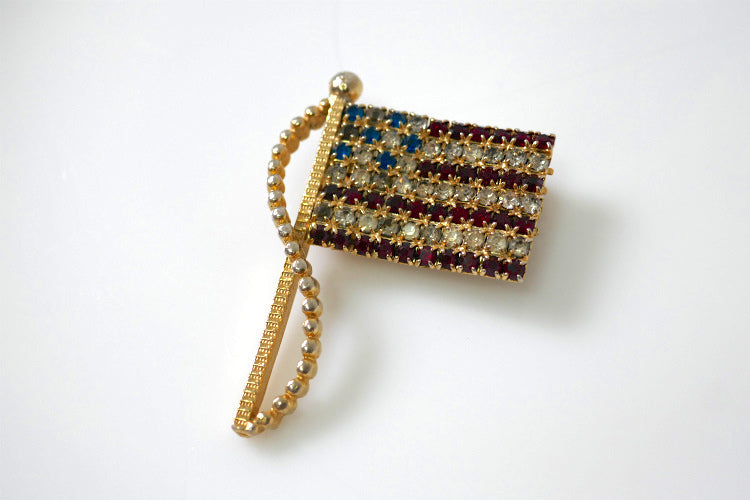 アメリカンフラッグの形をしたブローチで、フラッグ部分にブルー×ホワイト×レッドのラインストーンが敷き詰められた、ゴージャスな造りになっております。
