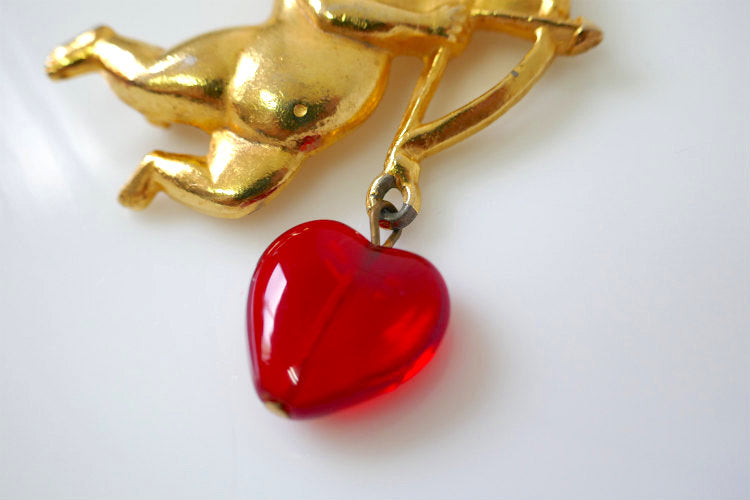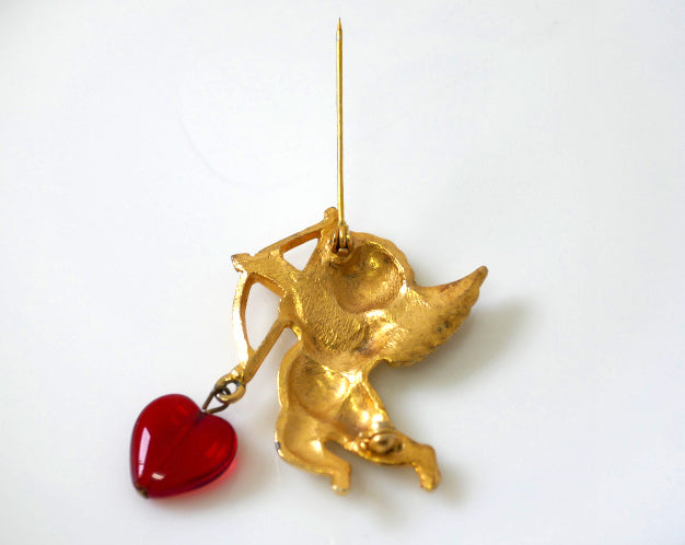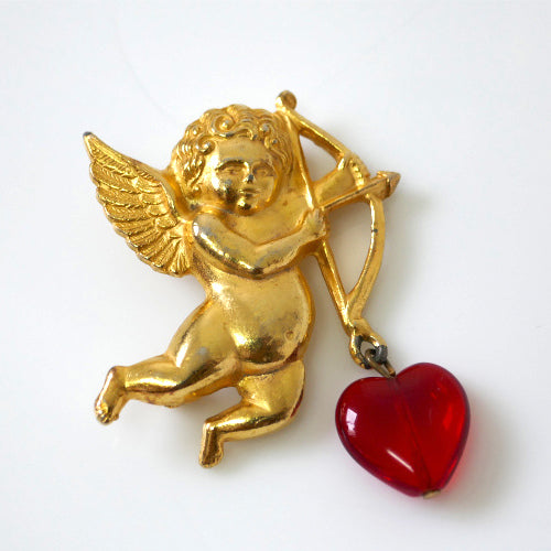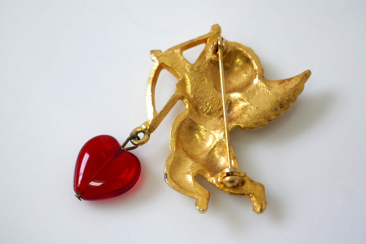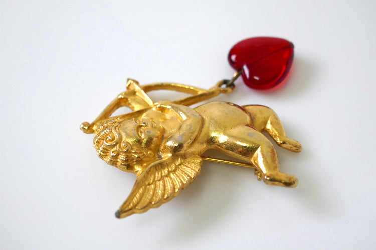 キューピッド ゴールドトーン 愛の神 赤いハート ヴィンテージ ブローチ アクセサリー コスチュームジュエリー USA