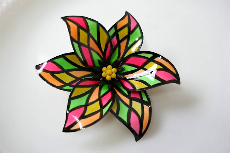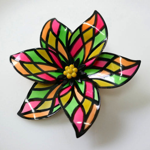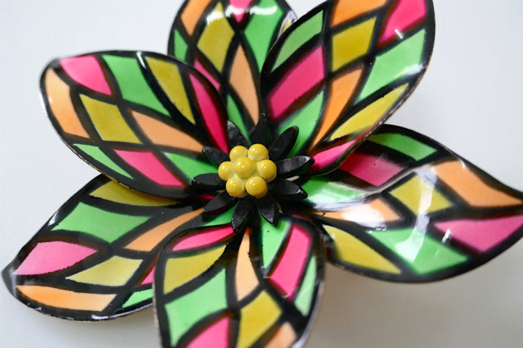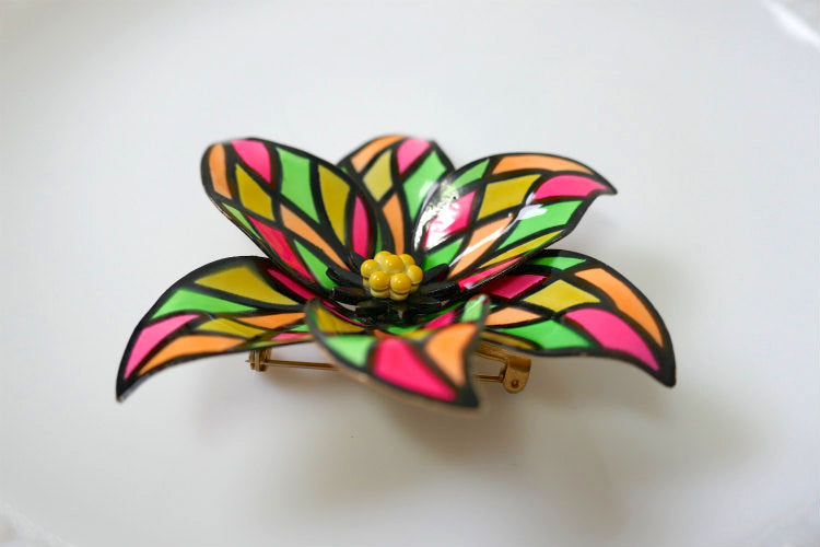 葉はピンク×イエロー×オレンジ×黄緑のカラフルなツヤのあるエナメルが施され、中央のブラック×イエローのガクはプックリとしており、レトロポップな可愛いお花の立体デザインです。