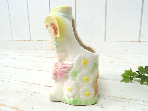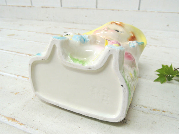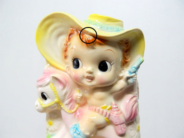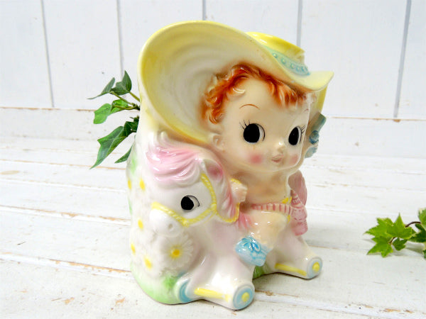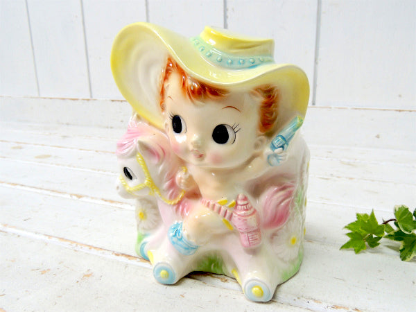 アメリカ西海岸、カリフォルニア州 サンフランシスコで見つけました・・お花畑で木馬に乗ったカウガールの陶器製・ヴィンテージ・ベビープランターです。