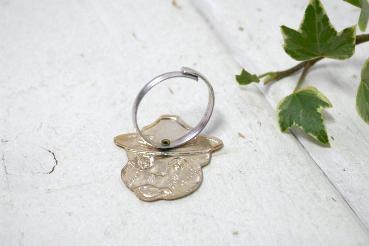 とても珍しいスモーキーベアのお顔の形をした指輪で、ゴールドがかったお色に、目は黒色、口は赤色にペイントされています。