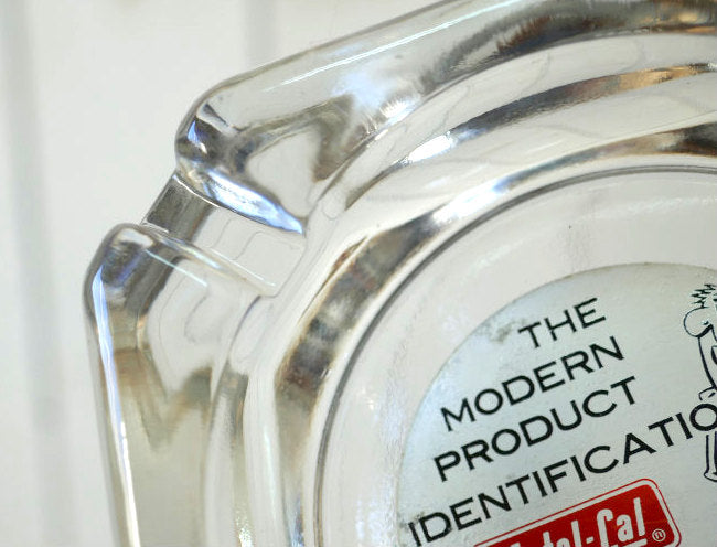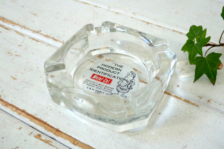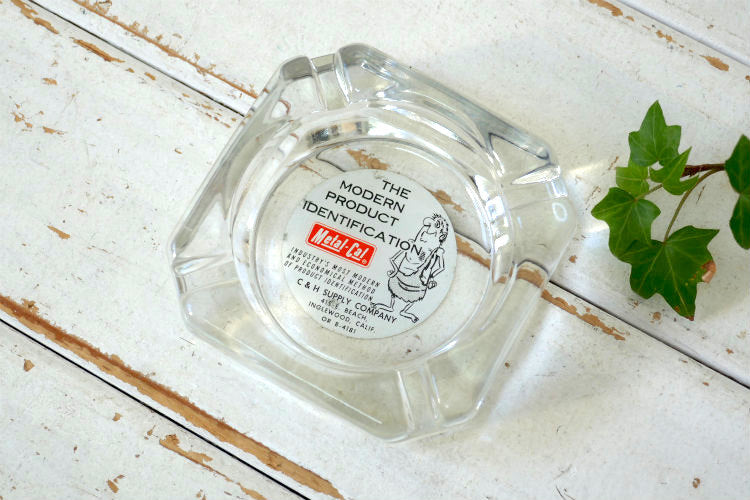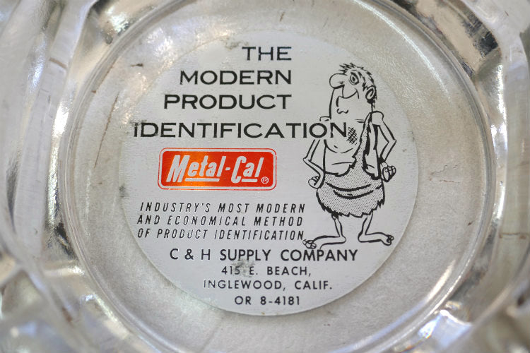 スクエア型のクリアガラス製の中央に、ターザンの様な姿のおじさん キャラクターの絵柄&【THE MODERN PRODUCT IDENTIFICATION / Metal- Cal®】&【INDUSTRY'S MOST MODERN AND ECONOMICAL METHOD OF PRODUCT IDENTIFICATION(業界で最も近代的で経済的です)】&【C & H SUPPLY COMPANY 415-E. BEACH, INGLEWOOD, CALIF. OR 8-4181】の英文字が入っています。
