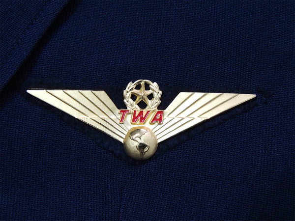 アメリカ西海岸・カリフォルニアで見つけました・・飛行機会社”TWA"パイロット・ウイング・バッジが付いていました・・機長さんのジャケット(USED・古着・コスプレ用)になります。(ウイングバッジは取り外しており、別売になります。)