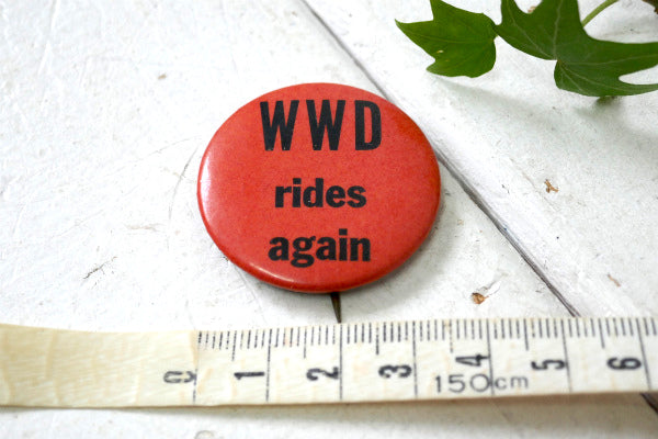 アメリカ南部・テキサス州・オースティンで見つけました・・・WWD rides again・ヴィンテージ メッセージ付き オールド 缶バッジ です。
