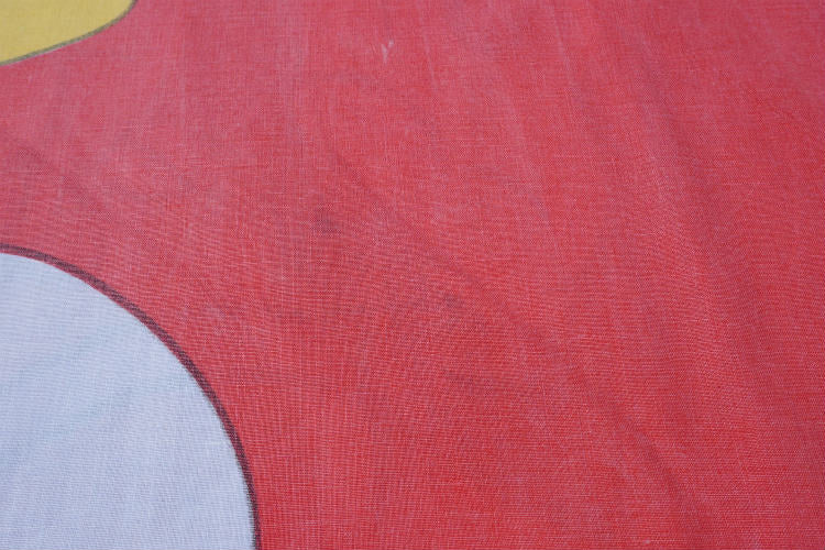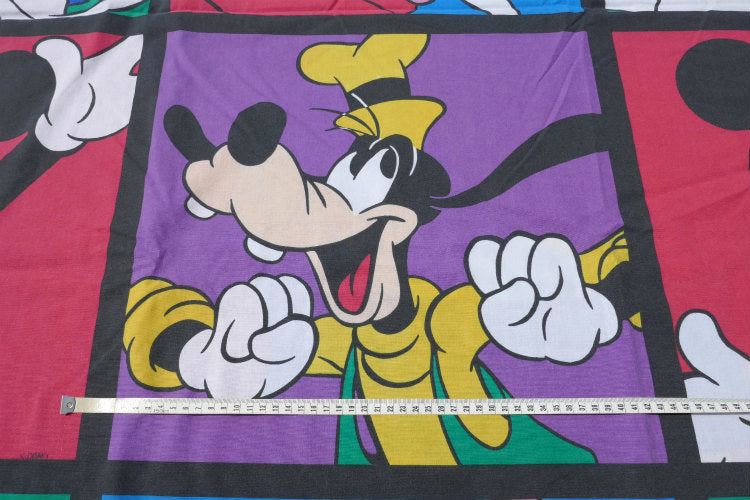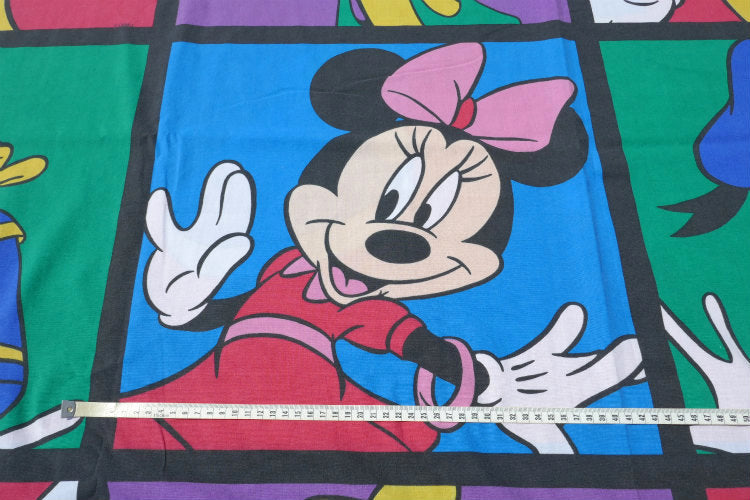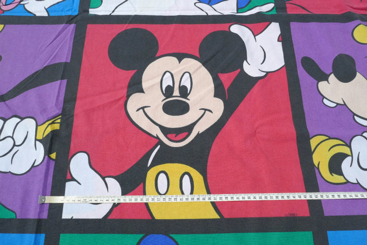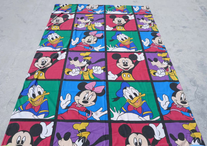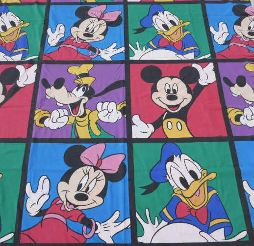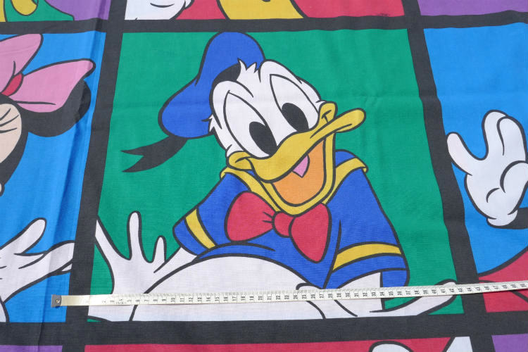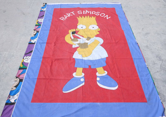 片面は、アメリカの人気 アニメシリーズ“ザ・シンプソンズ“のバート(全長146㎝)、もう片面には、カラフルな約43cm角のパネル枠内に、ミッキーマウスやミニーマウス・ドナルドダック・グーフィーなど、ディズニーの人気キャラクターがポーズを決めている、カラフル可愛い総柄プリントです。