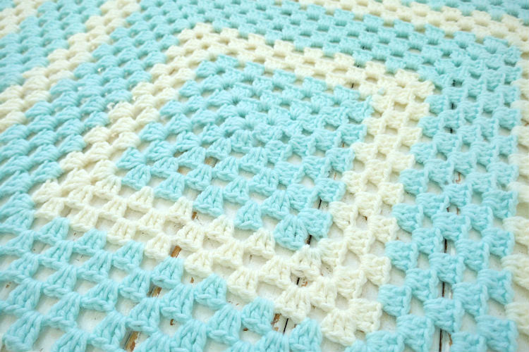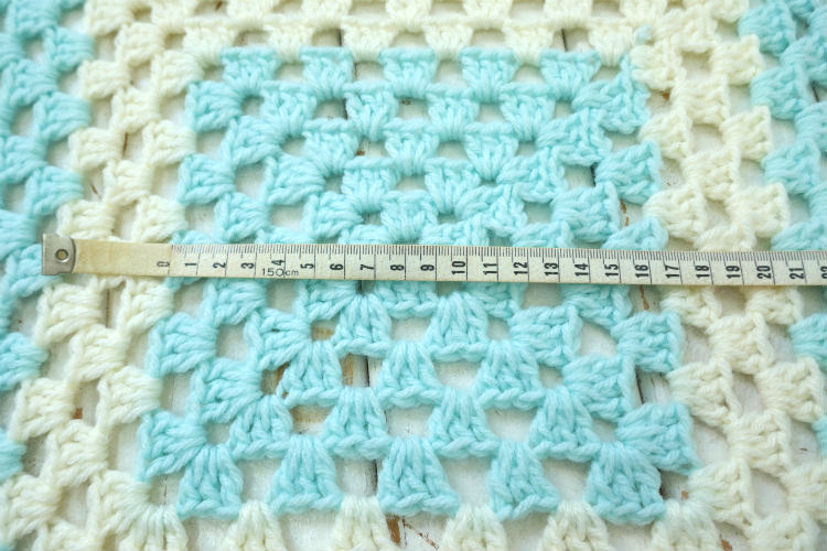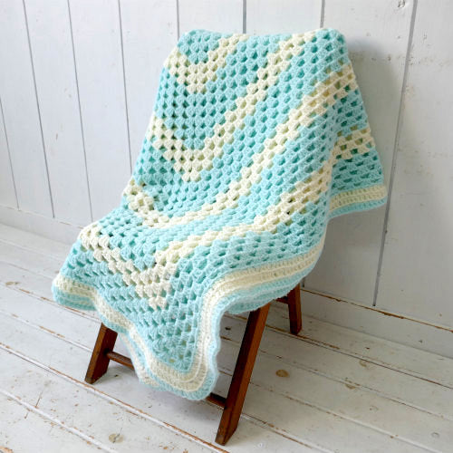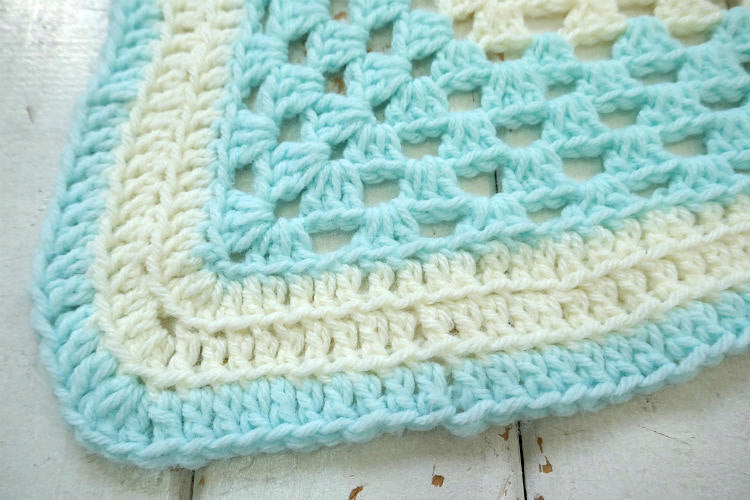 水色×アイボリーのやさしい配色で、丁寧に編まれています。