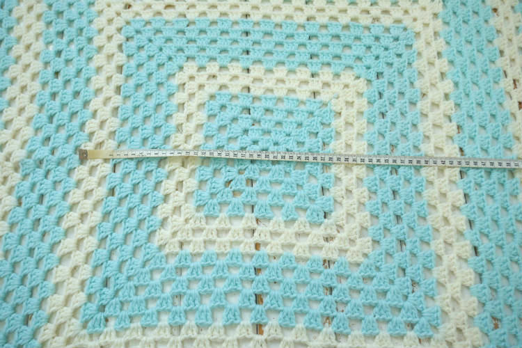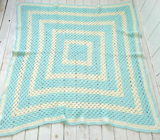 アメリカ 水色×アイボリー 正方形 ヴィンテージ ブランケット ひざ掛け ニットブランケット ハンドメイド 古着 USA