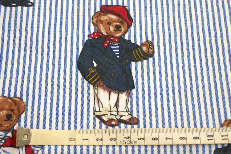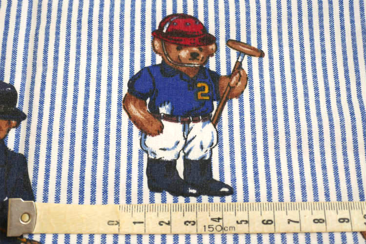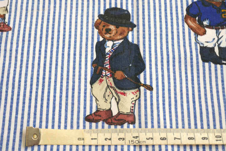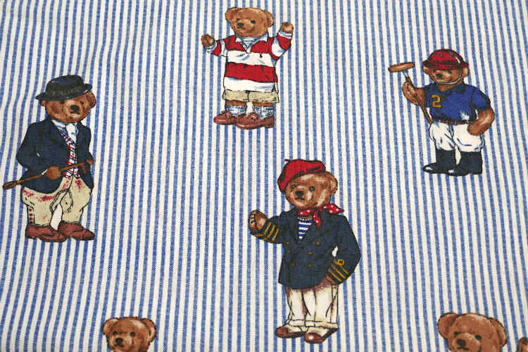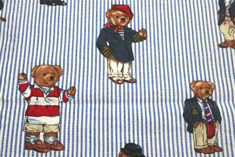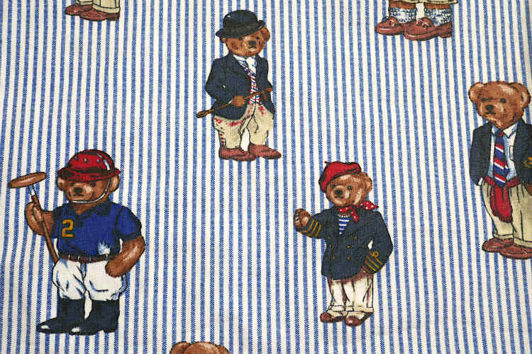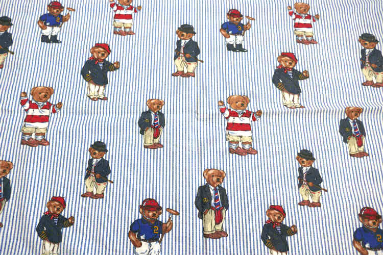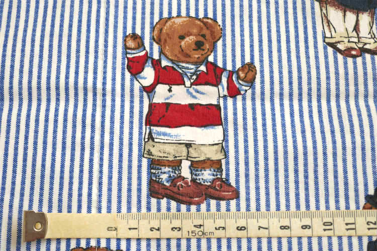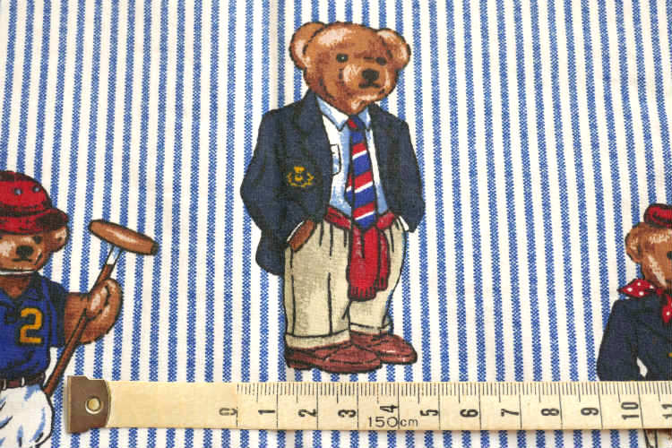 ホワイト×ブルーの細かなストライプベースに、クラシックなポロベアやお洒落な重ね着ルックのプレッピーベアの、総柄プリントです。