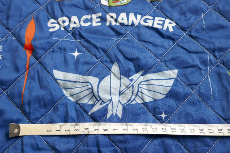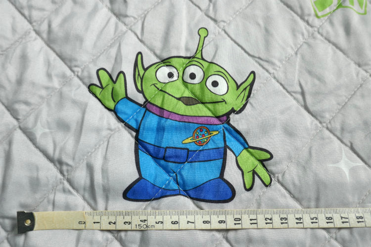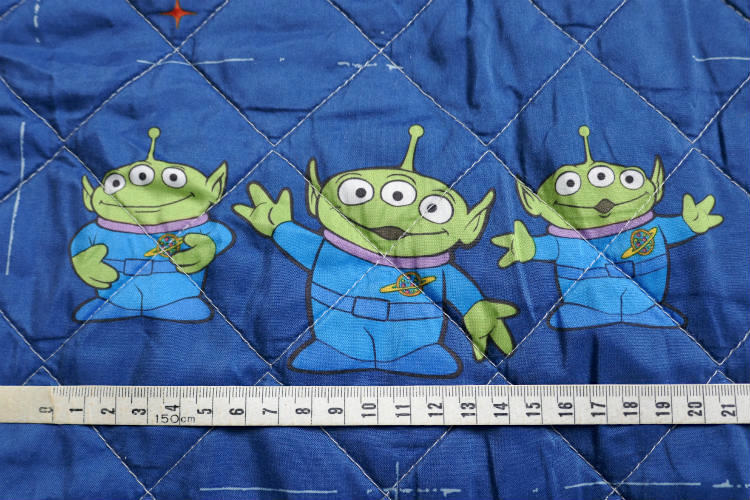 表面はブルーベースに、スペースレンジャーの宇宙柄にたくさんのバズ ライトイヤー&エイリアン、裏面はグレーベースにバズやウッディ・レックス・エイリアンの総柄プリントです。