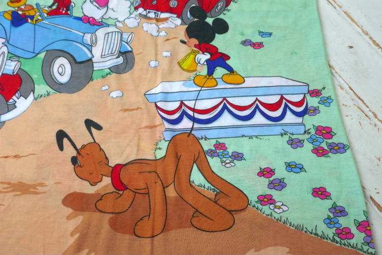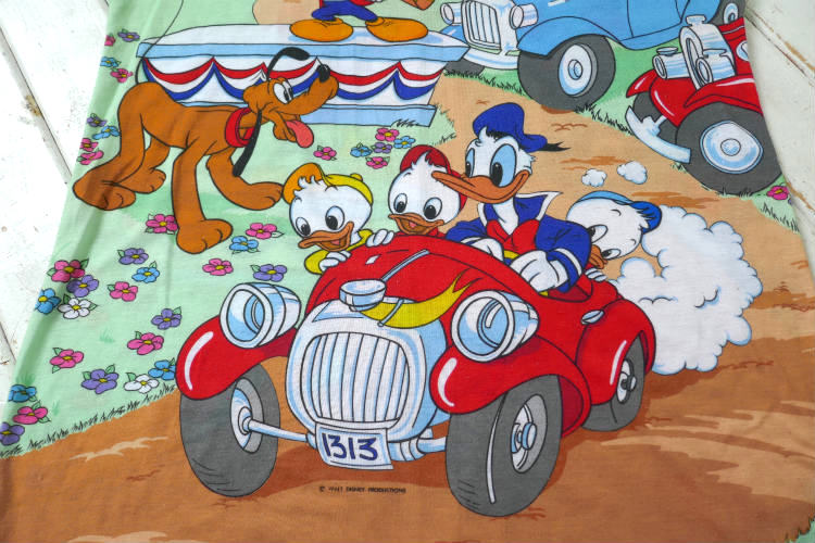 ステージの上で演説している″ミッキーマウス″、クラシックカーに乗ったお金持ち叔父さん″スクルージー・マクダック″と″ミニーマウス″、赤いオープンカーに乗った″ドナルドダック″と″ヒューイ・デューイ・ルーイ″、プルートの、カラフルなオールオーバープリントです。