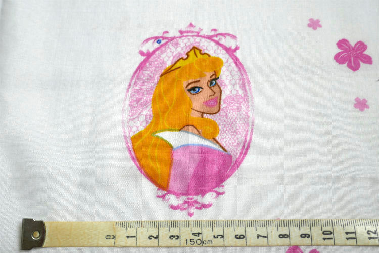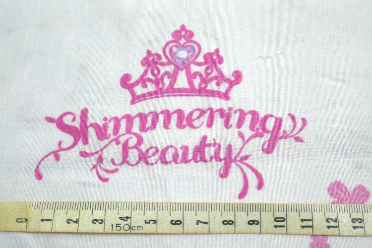 ホワイトベースに、ディズニー映画に登場するお姫様のキャラクター【シンデレラ】【眠れる森の美女のオーロラ姫】【美女と野獣のベル】&【Shimmering Beauty(きらめく美しさ)ロゴ】の、メルヘンな総柄プリントです。