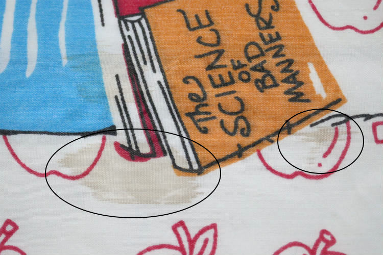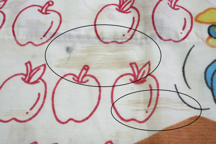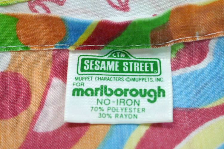 アメリカ西海岸・カリフォルニア州・ロサンゼルスで見つけました・・『セサミストリート』のスクール&リンゴ柄・ヴィンテージ・USEDフラットシーツ(ハーフサイズ)です。