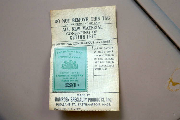 背もたれ裏のデカールに【HAMPDEN SPECIALTY PRODUCTS, Inc. EASTHAMPTON, MASS.】、座面裏のタグに【 DO NOT REMOVE THIS TAG UNDER PENALTY OF LAW / ALL NEW MATERIAL CONSISTING OF COTTON FELT / REGISTRY NO. CONNECTICUT 274(MASS:) / MADE BY HAMPDEN SPECIALTY PRODUCTS, Inc PLEASANT ST., EASTHAMPTON, MASS.】とございます。