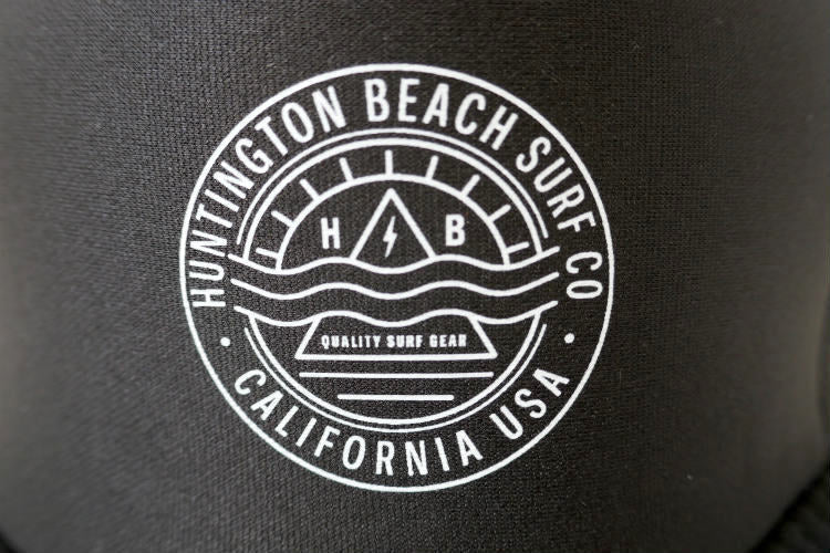ブラックボディに、【HUNTINGTON BEACH SURF CO.・CALIFORNIA USA・HB QUALITY SURF GEAR】のホワイトロゴがプリントされています。
